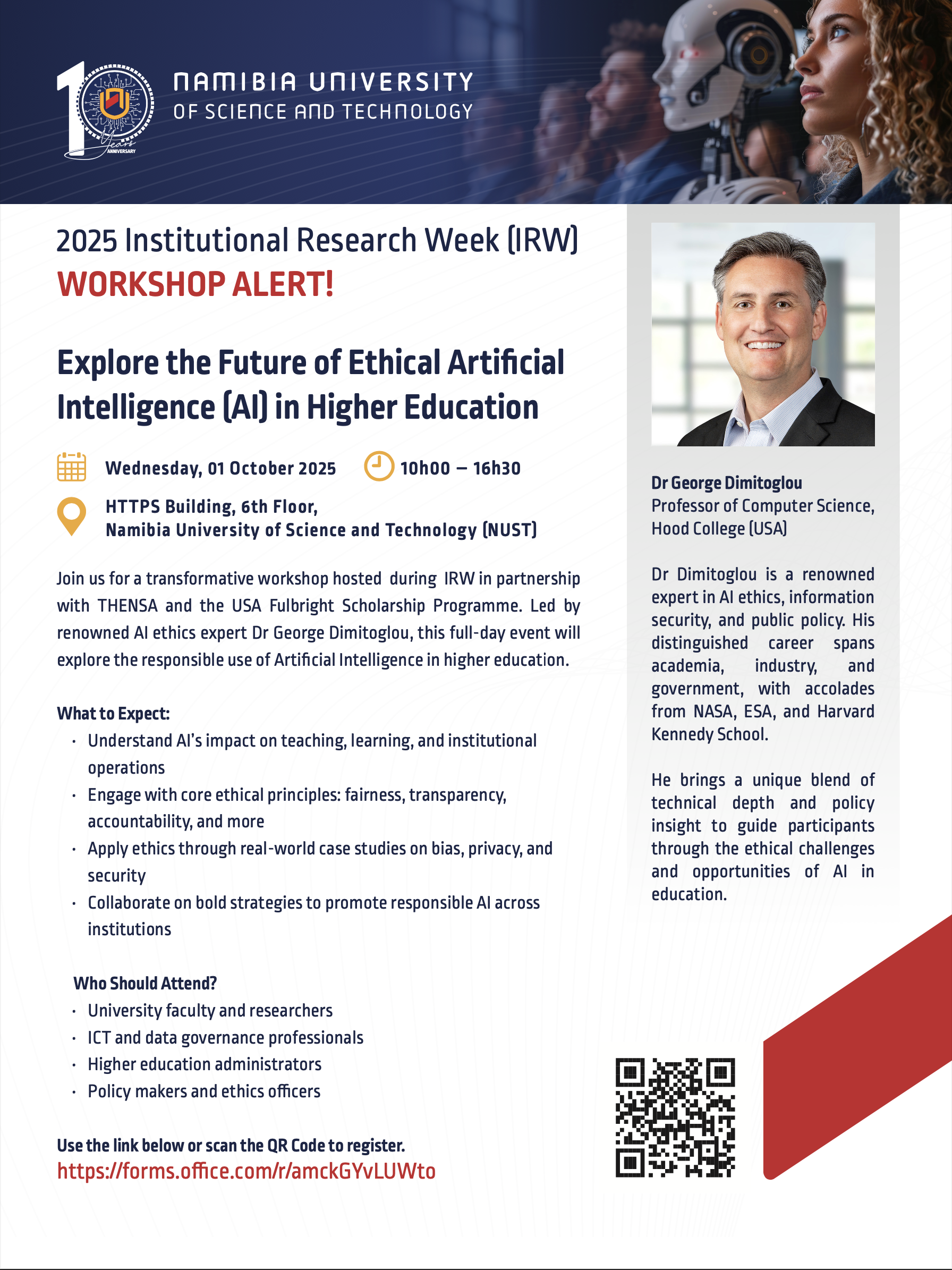 01-10-2025 10h00 – 16h30 HTTPS Building, 6th Floor, Namibia University of Science and Technology (NUST) 2025 Institutional Research Week (IRW) NUST Faculty/Department/Unit/Section/Institute NUST Event Type Research Event Audience Event Experience In Person Cost Free MORE INFORMATION Download More Information Use the link below or scan the QR Code to register