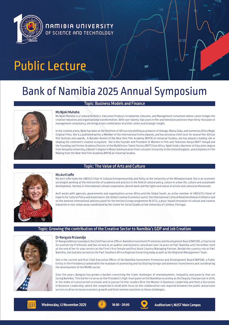 12-11-2025 18:00 - 20:00 Auditorium 1, NUST Main Campus Public Lecture: Bank of Namibia 2025 Annual Symposium NUST Faculty/Department/Unit/Section/Institute NUST Event Type Public Lecture Event Audience Academic Public Staff Event Experience In Person Cost Free MORE INFORMATION Download More Information