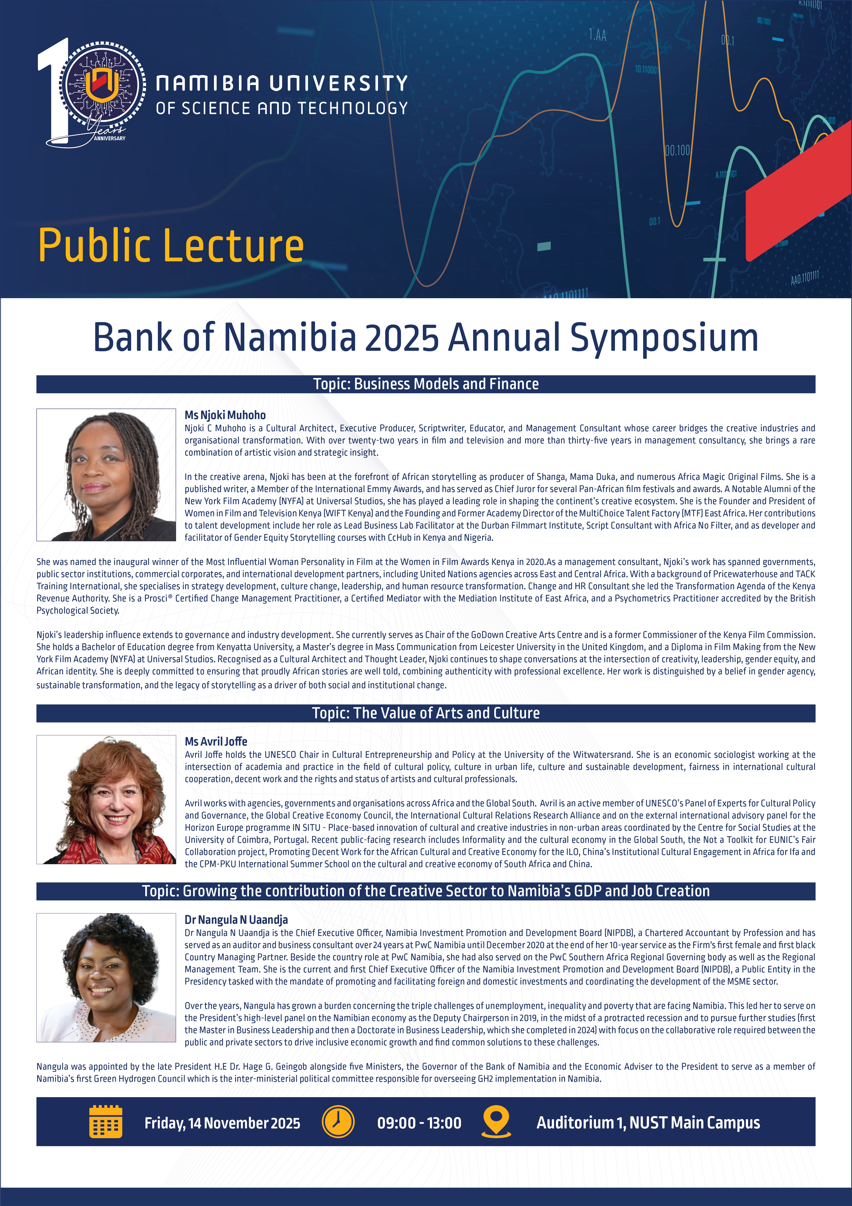 14-11-2025 09:00 - 13:00 Auditorium 1, NUST Main Campus Public Lecture: Bank of Namibia 2025 Annual Symposium NUST Faculty/Department/Unit/Section/Institute NUST Event Type Public Lecture Event Audience Academic Public Staff Event Experience In Person Cost Free MORE INFORMATION